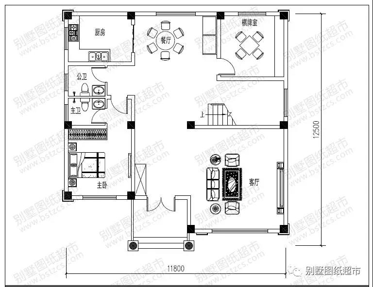 一 層:客廳(中空)、臥室(附衛(wèi)生間)、棋牌室、廚房、餐廳、衛(wèi)生間