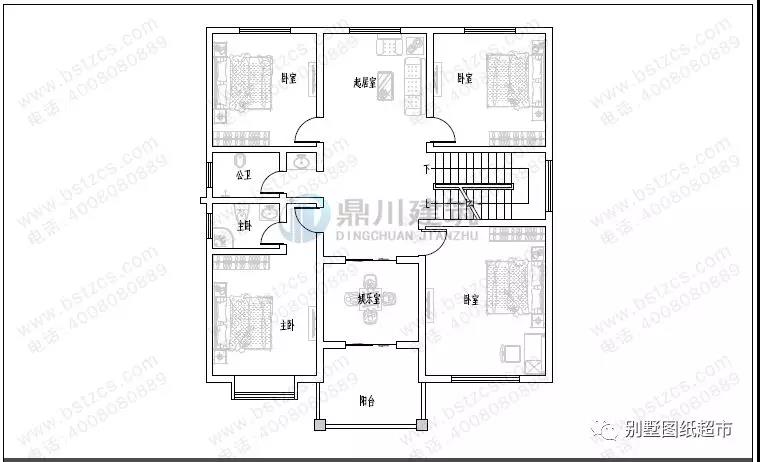 三 層:臥室(附更衣間,衛(wèi)生間,陽(yáng)臺(tái))、臥室(附書(shū)房)、臥室、娛樂(lè)室(附露臺(tái))、衛(wèi)生間
