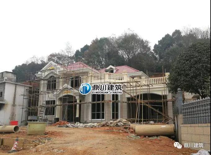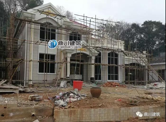 建房實拍圖和效果圖高度一致。淺色的外墻色調精致典雅,金色的山花,紅色的外墻讓房子整體效果更加生動活潑。