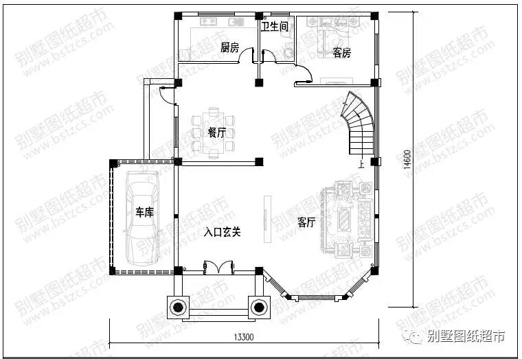 一 層:入口玄關(guān)、客廳、餐廳、廚房、客房、衛(wèi)生間、車庫