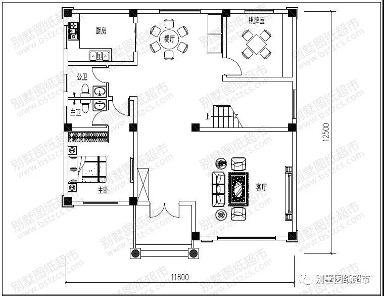 一 層:客廳(中空)、臥室(附衛生間)、臥室、棋牌室、廚房、餐廳、衛生間