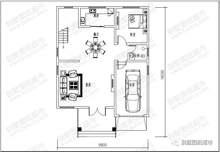 一 層:客廳、臥室、棋牌室、廚房、餐廳、衛生間、儲藏室、車庫