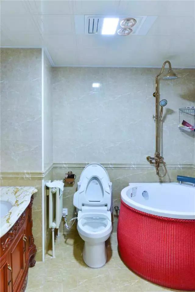 ▲圓形造型的浴缸,是不是跟古時候的圓木桶很像,外面還包了一層紅色裝飾真的很亮眼!