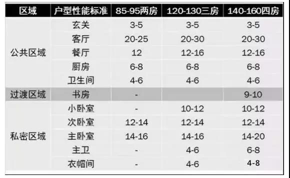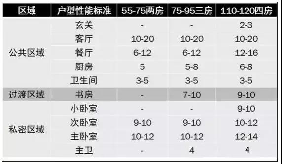 舒適型戶型各功能房間指標小結(套內面積):