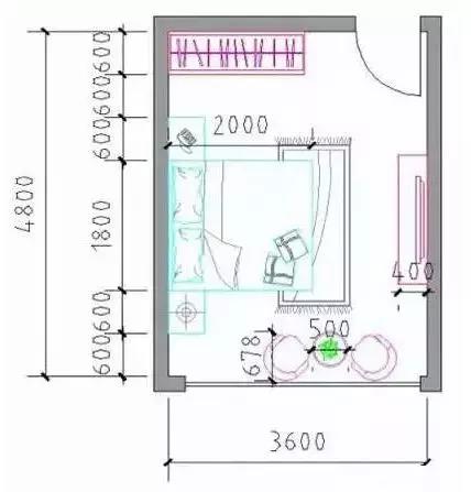 凈寬:床長度2000mm+臥室門1000mm,開間≥3000mm;