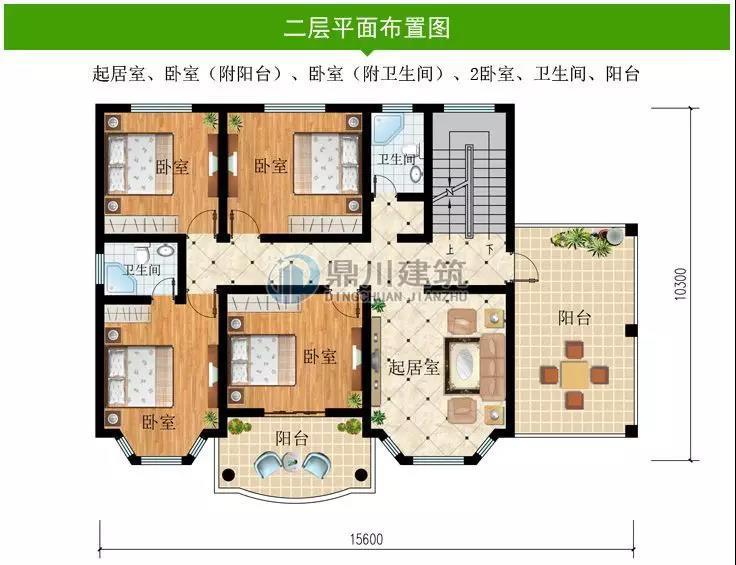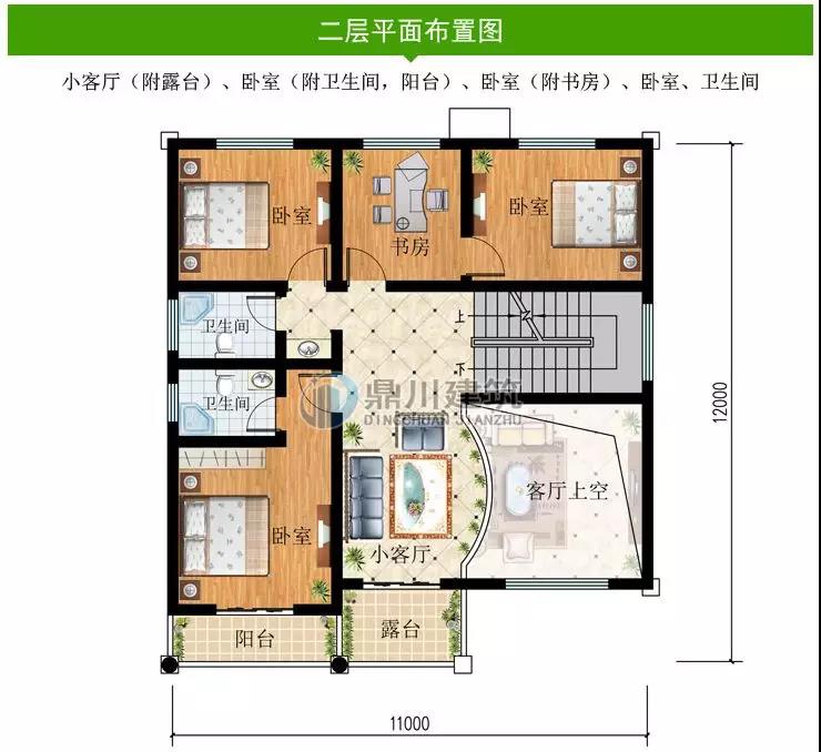二 層:客廳(附露臺)、臥室(附衛生間,陽臺)、臥室(附書房)、臥室、衛生間