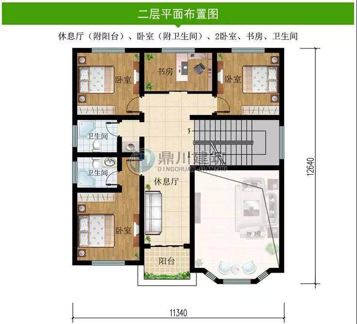 二 層:休息區(附陽臺)、臥室(附衛生間)、2臥室、書房、衛生間