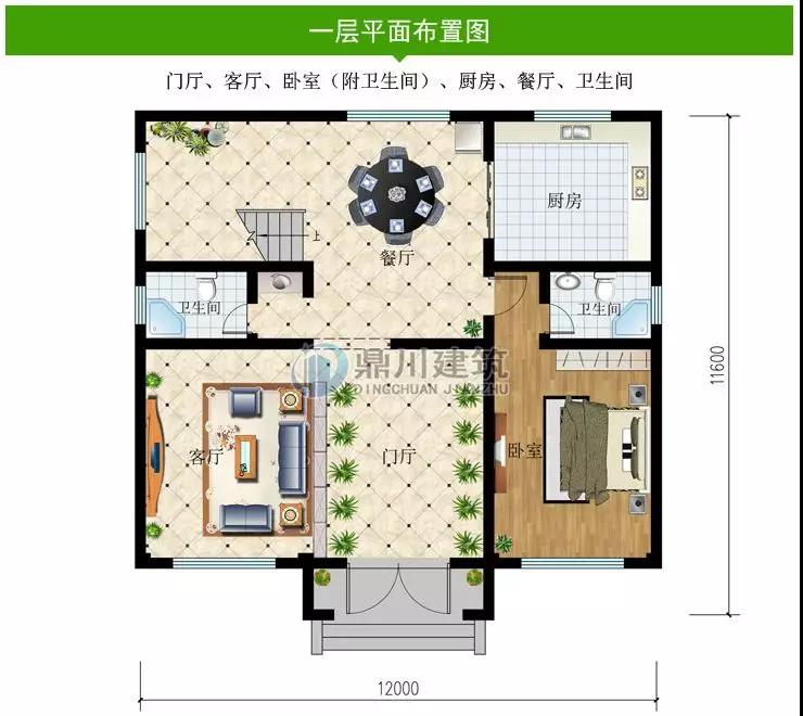 一 層:門廳、客廳、臥室(附衛生間)、廚房、餐廳、衛生間