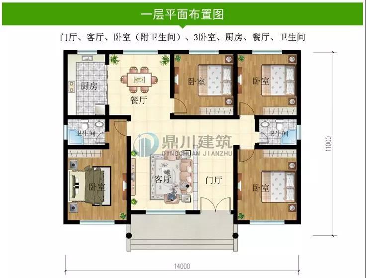 一 層:門廳、客廳、臥室(附衛生間)、3臥室、廚房、餐廳、衛生間