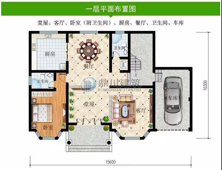 一 層:堂屋、客廳、臥室(附衛生間)、廚房、餐廳、衛生間、車庫