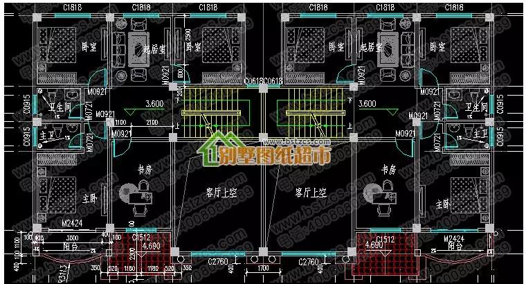 二 層:主臥(附書房,衛生間,陽臺)、臥室(附書房,陽臺)、臥室、衛生間