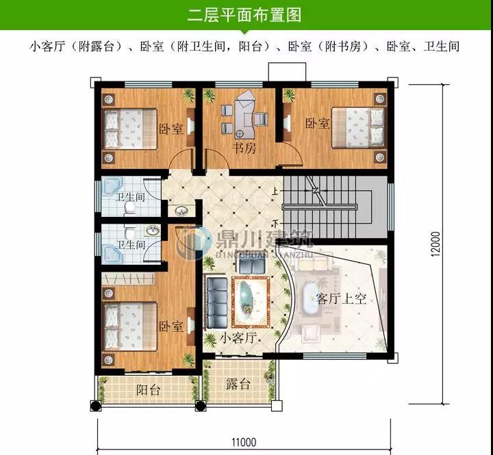二 層:休息區(qū)(附陽臺(tái))、臥室(附衛(wèi)生間)、2臥室、書房、衛(wèi)生間