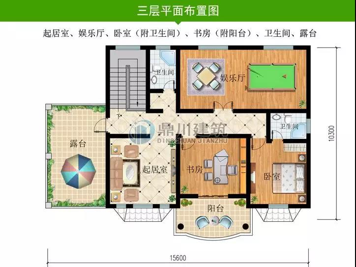 三 層:起居室、娛樂廳、臥室(附衛(wèi)生間)、書房(附陽臺(tái))、衛(wèi)生間、露臺(tái)