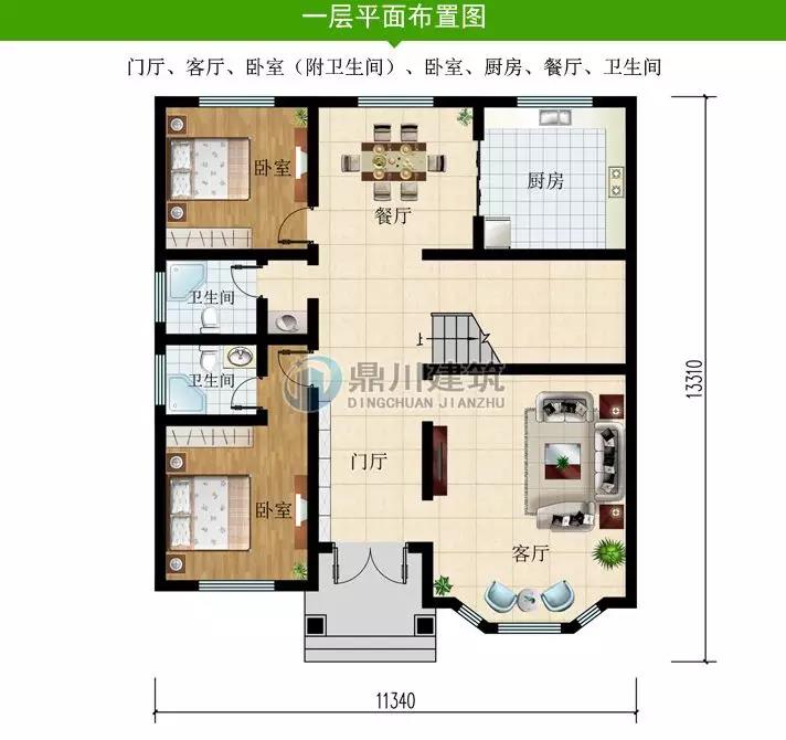 一 層:客廳、臥室(附衛(wèi)生間)、臥室、廚房、餐廳、衛(wèi)生間