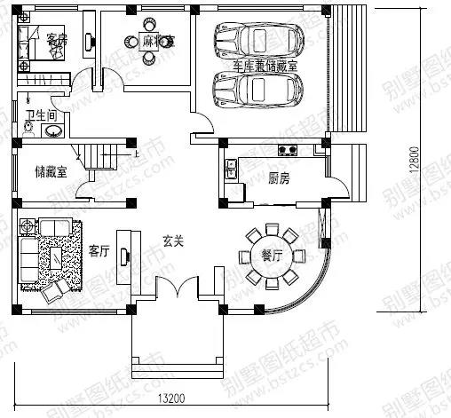 一 層:客廳、麻將室、客房、廚房、餐廳、衛生間、儲藏室、車庫