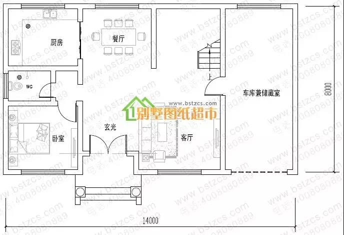 一 層:客廳、臥室、廚房、餐廳、衛(wèi)生間、車庫(kù)(兼儲(chǔ)藏室)