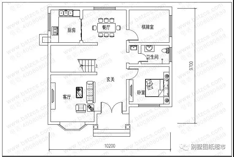 一 層:玄關(guān)、客廳、臥室、棋牌室、廚房、餐廳、衛(wèi)生間