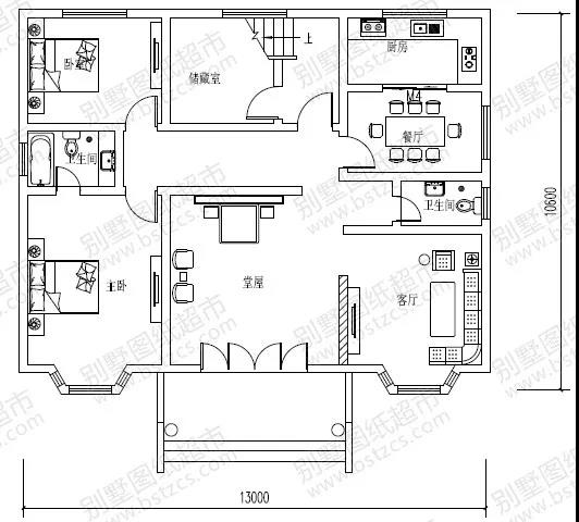 一 層: 堂屋、客廳、主臥(附衛生間)、臥室、廚房、餐廳、儲藏室、衛生間