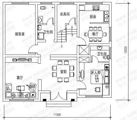 一 層: 堂屋、客廳、老人房(附衛生間)、娛樂室、廚房、餐廳、農具間、衛生間