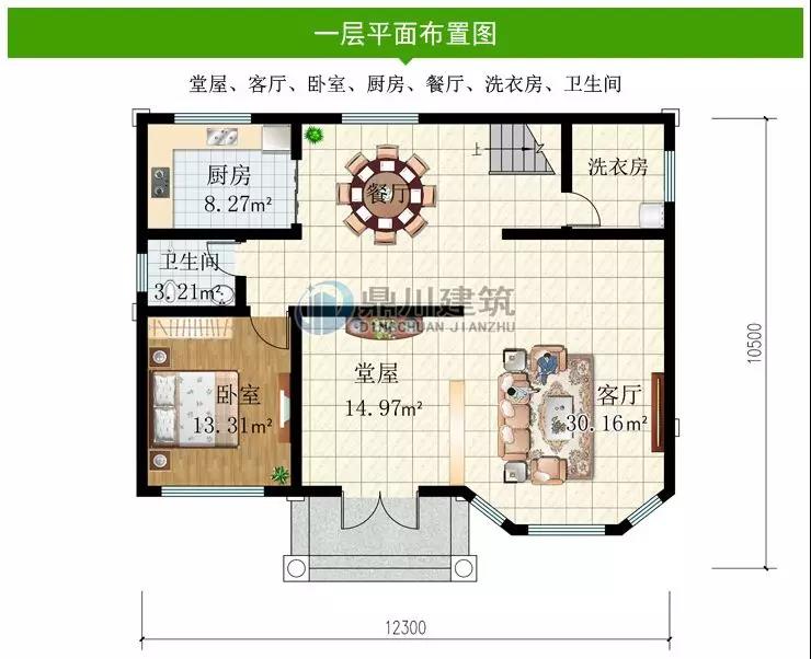一層功能設(shè)計:堂屋、客廳、臥室、廚房、餐廳、洗衣房、衛(wèi)生間。
