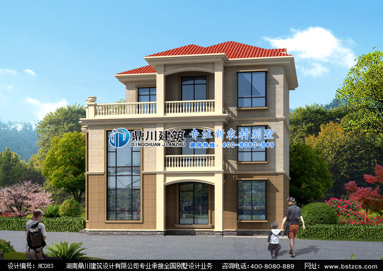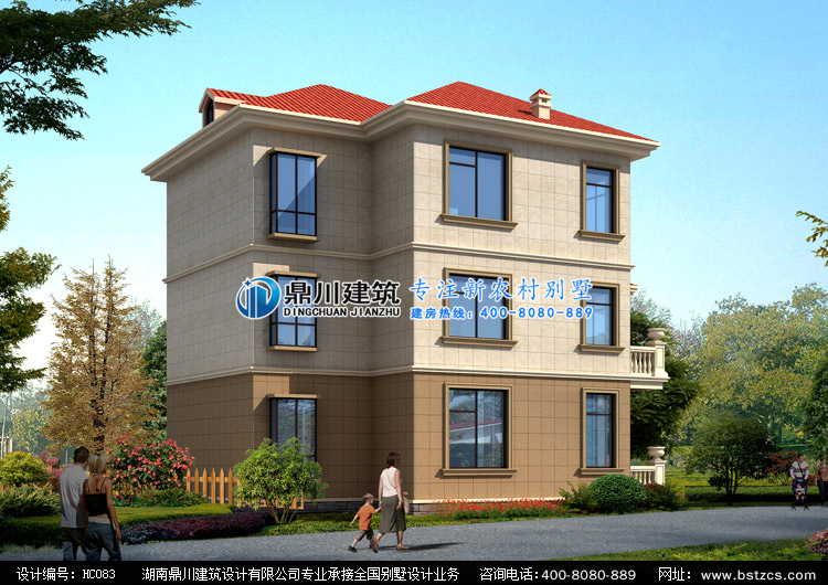 HC083復式三層農村別墅圖紙外觀效果圖,鼎川建筑三層農村住宅別墅外觀效果圖
