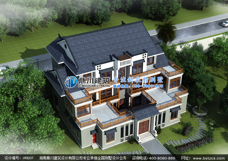 GWK007三層中式別墅設計圖紙外觀效果圖,中式三層農村自建房屋設計圖效果圖