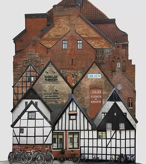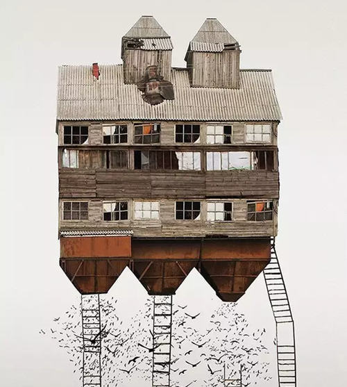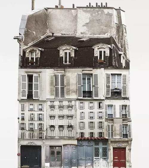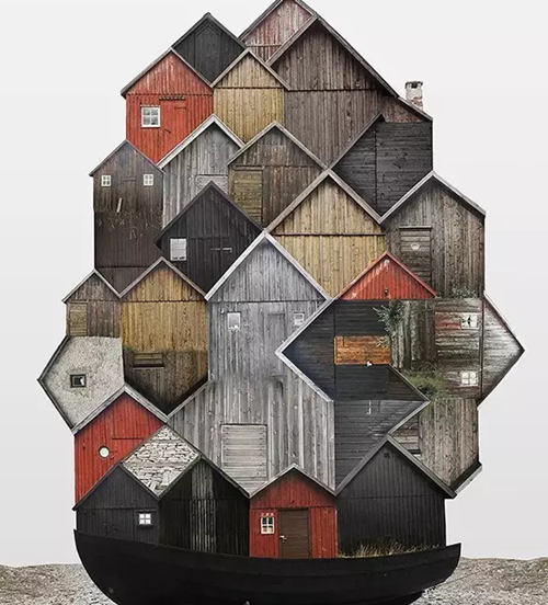 該系列拼接畫名為“genius loci(地方風氣)”,描繪了由許多小房屋構(gòu)成的大房子,這些房屋都是某個地方或國家特有的風格。它們連接著這些地方的土地,承載著這些地方的精神,不僅體現(xiàn)了虛擬的建筑現(xiàn)實(由各種門窗隨意、古怪地堆積在一起),而且體現(xiàn)了當?shù)氐奈幕蜕罘绞健?/p>