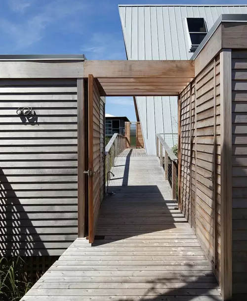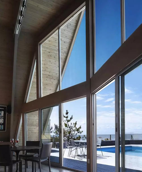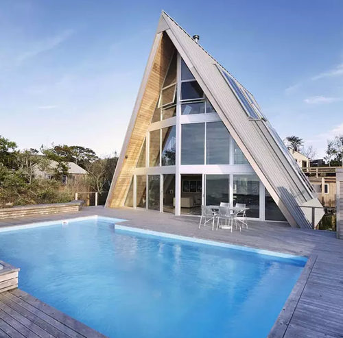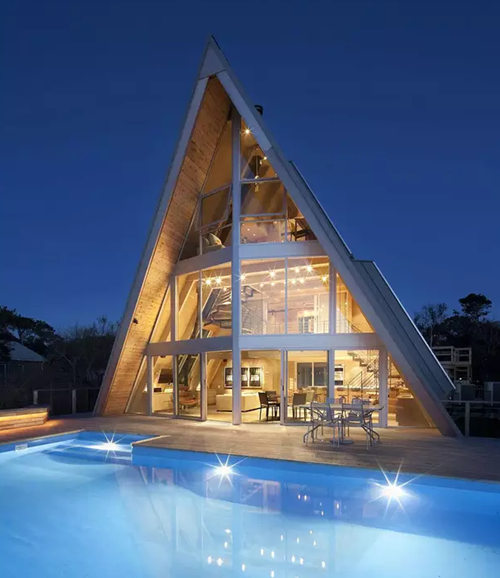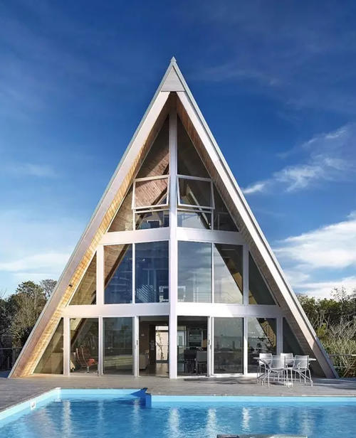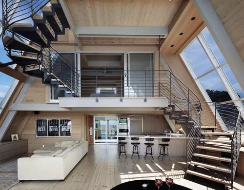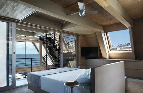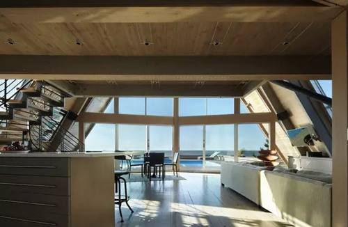 這棟別墅是在一個舊的三角型斜頂型老房子的基礎上改造完成,經過精心的設計和施工,賦予了現代建筑元素和功能,房子外表用金屬鋁板包裹,朝海的一面做了大面積的玻璃幕墻,很難再讓人看出這是棟舊建筑。 房子內部的布局也非常有特點,房子共有三層,由一部旋轉樓梯連接,越向上面積越小,客廳做成了中空,欣賞海景時可以看到更多藍天,同時每個房間都開了斜窗,保證了陽光的充足。