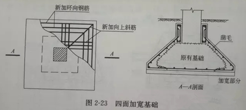 若是獨(dú)立基礎(chǔ)則采用四面加寬的加固方式,每邊加寬應(yīng)不小于30cm并配置相應(yīng)鋼筋,原基礎(chǔ)表面要鑿毛并插筋,盡最大可能將加固混凝土與原混凝土結(jié)合在一起。