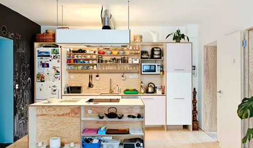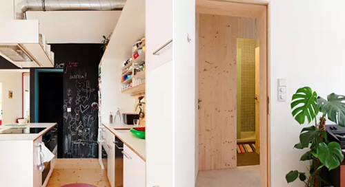 從公共區域一直延伸到房間都是以淺色系的木底板或地毯鋪陳,甚至是每個門窗的邊框以及柜體和廚具都可以看到淺色系的木作質感,讓空間有產生連慣性和整體感。