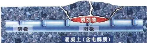 膨脹力致使混凝土開裂、剝落,且鐵銹組織疏松,空氣不斷進入,加速鋼筋銹蝕膨脹力繼續增大……上述過程不斷重演。結果就是鋼筋混凝土構件截面和鋼筋本身截面全都由表至里不斷減小,同時鋼筋與混凝土之間握裹力被銹層隔斷,危害整個結構的受力體系!