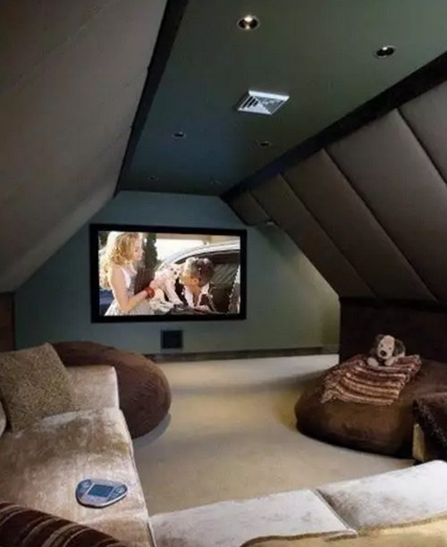 7、家庭電影放映室。需要注意的是隔音、吸音效果要比其他地方要強,要保證良好的音響效果,要考慮到墻、電工工程及防火材料等必要條件。