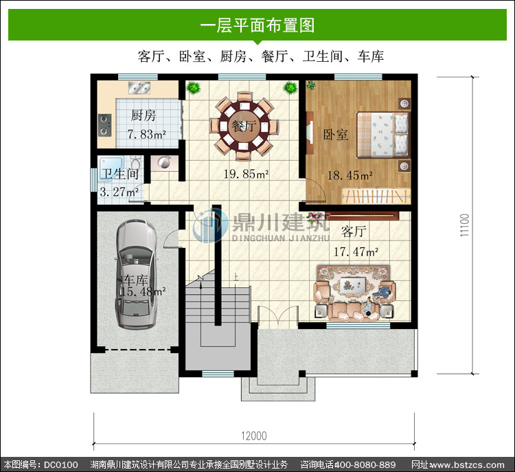 一 層: 客廳、臥室、廚房、餐廳、衛生間、車庫