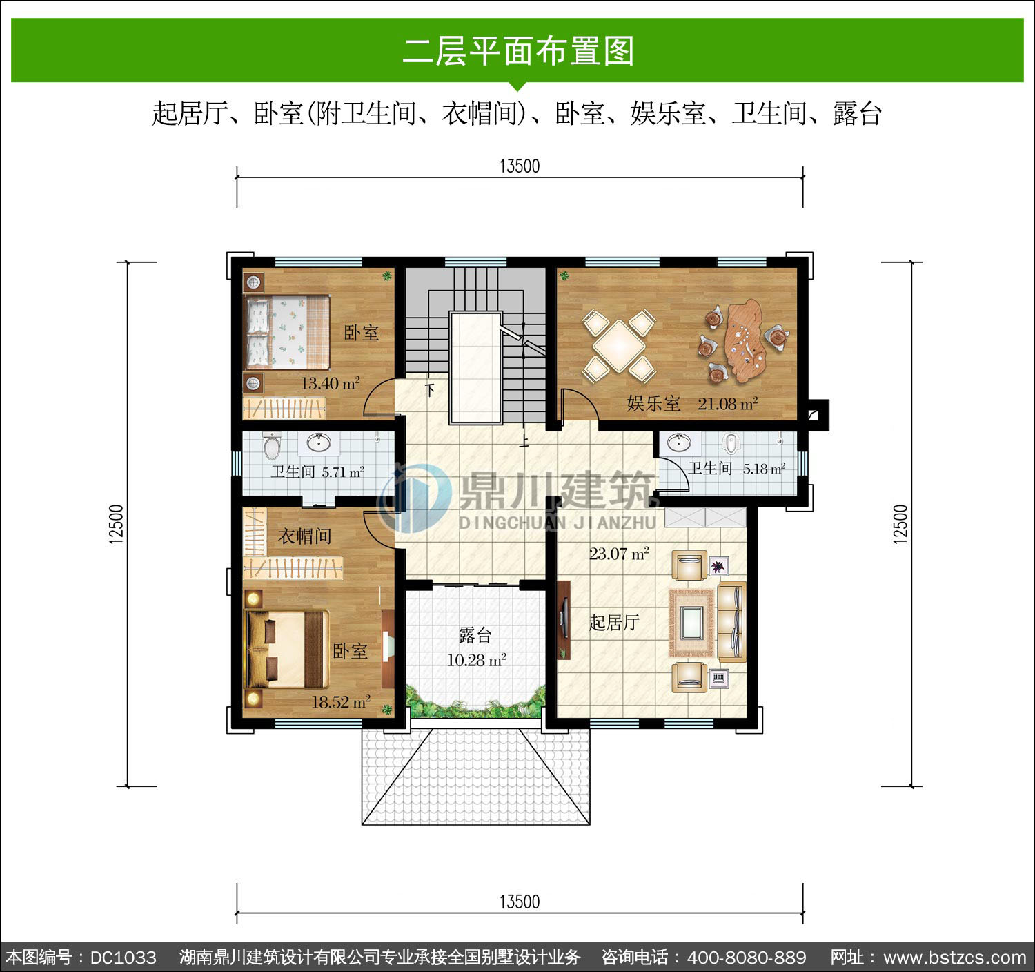| 二 層: | 起居廳、臥室(附衛生間、衣帽間)、臥室、娛樂室、衛生間、露臺 | |||