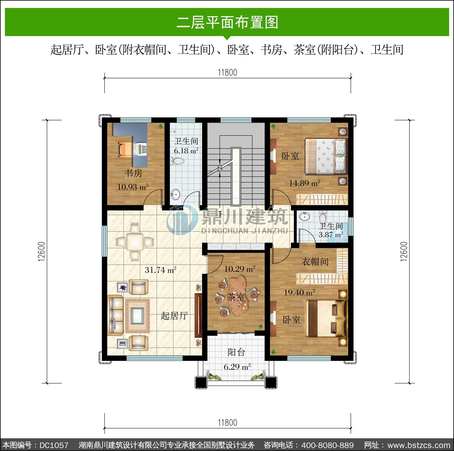 | 二 層: | 起居廳、臥室(附衣帽間、衛生間)、臥室、書房、茶室(附陽臺)、衛生間 | |||