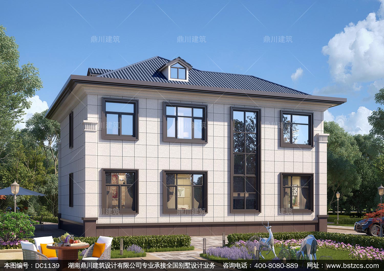 新中式二層帶露臺別墅圖紙及效果圖_新農村自建別墅設計,鼎川建