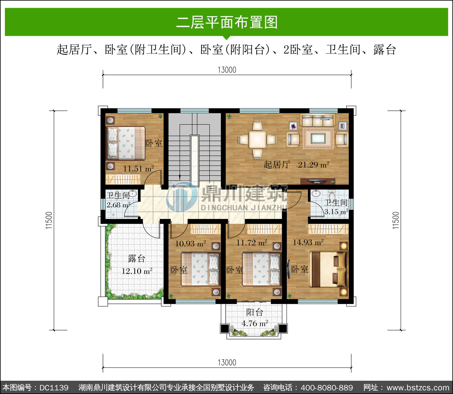 | 二 層: | 起居廳、臥室(附衛生間)、臥室(附陽臺)、2臥室、衛生間、露臺 | |||