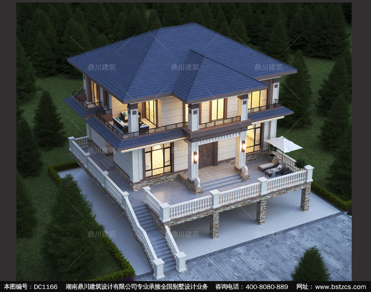 新中式二層帶架空層別墅圖紙及效果圖_新農村自建別墅設計,鼎川建筑