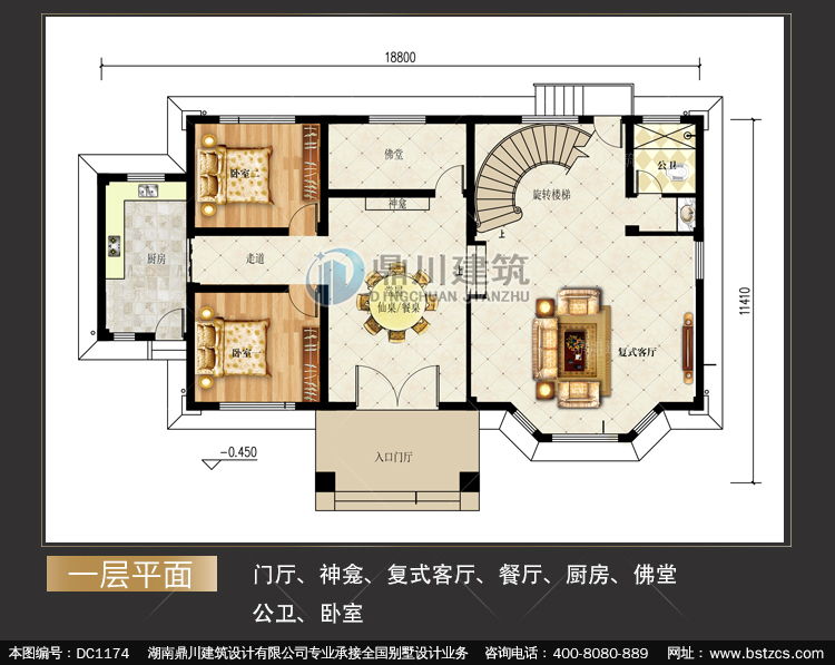 | 一 層: | 門廳、神龕、復式客廳、餐廳、廚房、佛堂、公衛、臥室 | |||