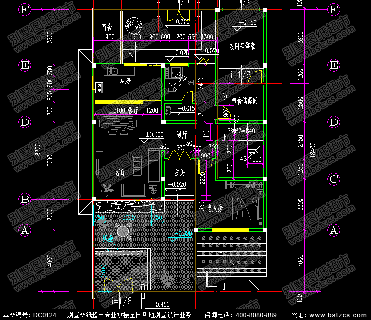 一 層: 客廳、老人房、廚房、餐廳、衛生間、儲藏間、農用車庫、畜舍