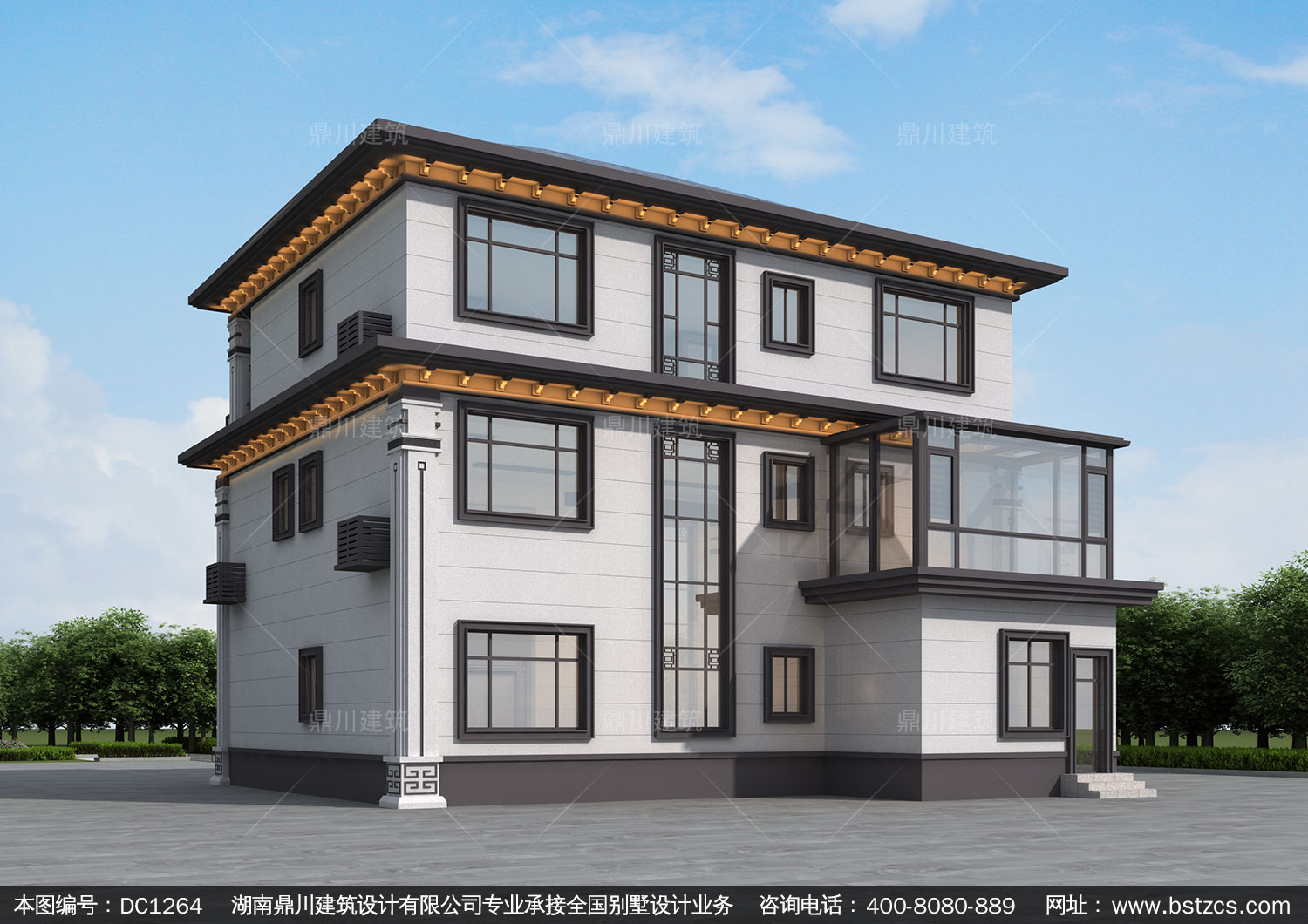 新中式三層帶露臺別墅圖紙效果圖_農村自建別墅設計,鼎川建筑