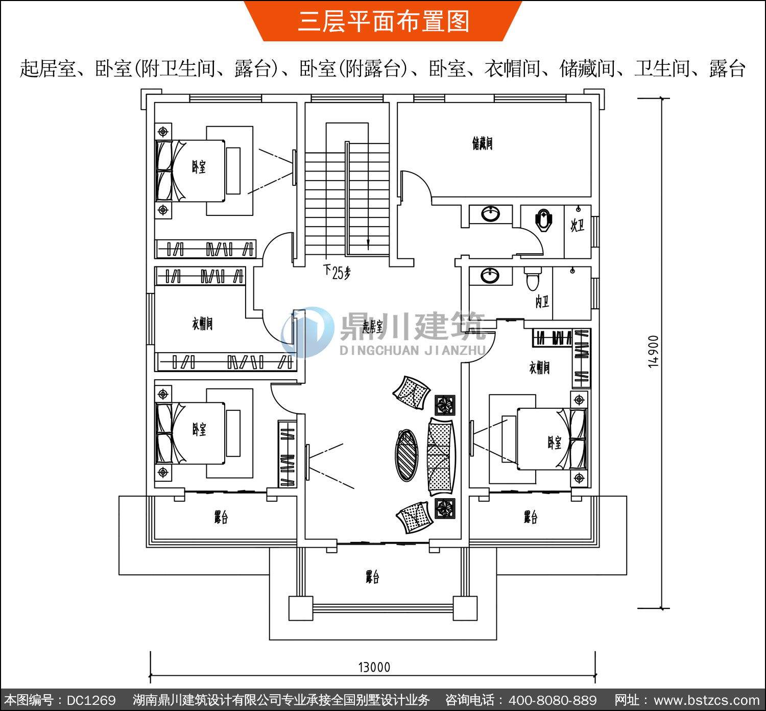 | 三 層: | 起居室、臥室(附衛生間、露臺)、臥室(附露臺)、臥室、衣帽間、儲藏間、衛生間、露臺 | |||