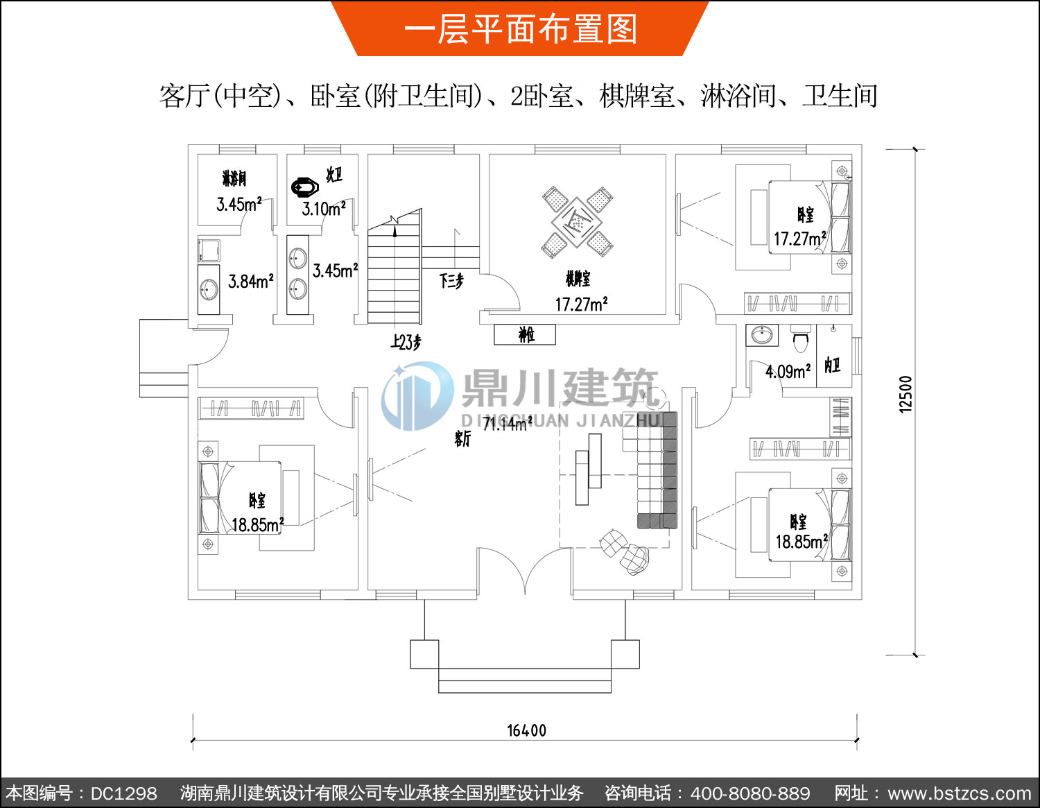 | 一 層: | 客廳(中空)、臥室(附衛(wèi)生間)、2臥室、棋牌室、淋浴間、衛(wèi)生間 | |||