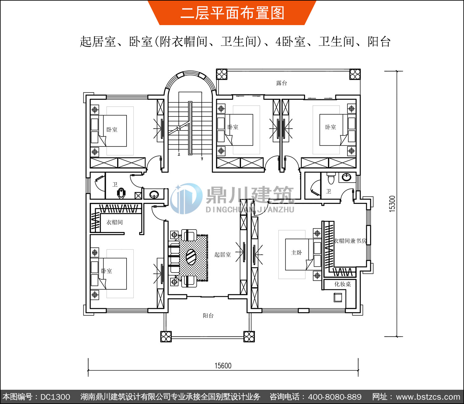 | 二 層: | 起居室、臥室(附衣帽間、衛生間)、4臥室、衛生間、陽臺 | |||
