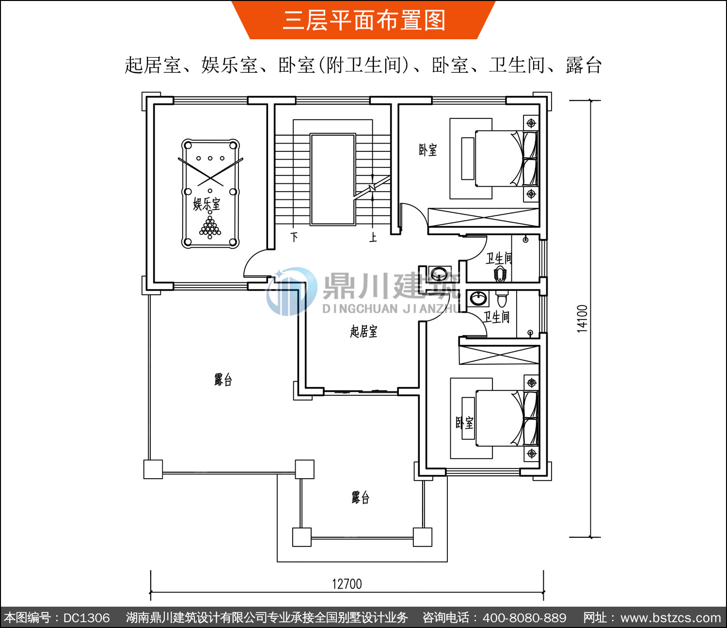 | 三 層: | 起居室、娛樂室、臥室(附衛生間)、臥室、衛生間、露臺 | |||