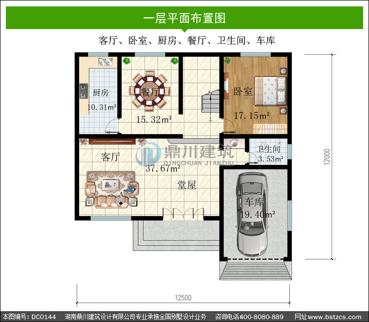 | 一 層: | 客廳、臥室、廚房、餐廳、衛生間、車庫 | |||