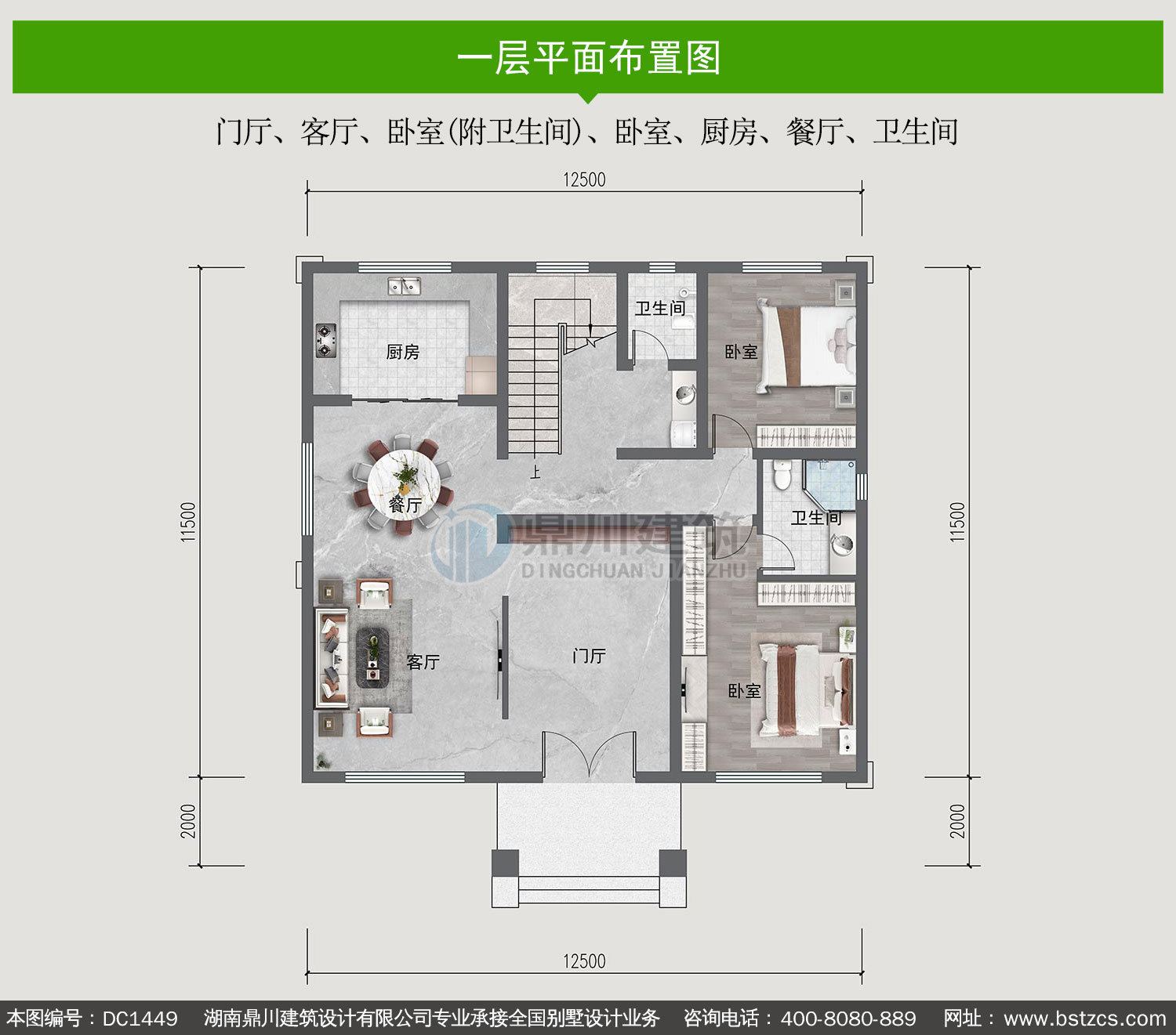 一 層: 門廳、客廳、臥室(附衛生間)、臥室、廚房、餐廳、衛生間