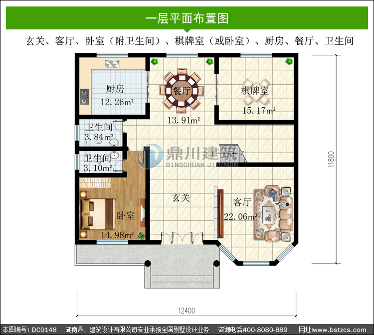 一 層: 玄關、客廳、臥室(附衛生間)、棋牌室(或臥室)、廚房、餐廳、衛生間