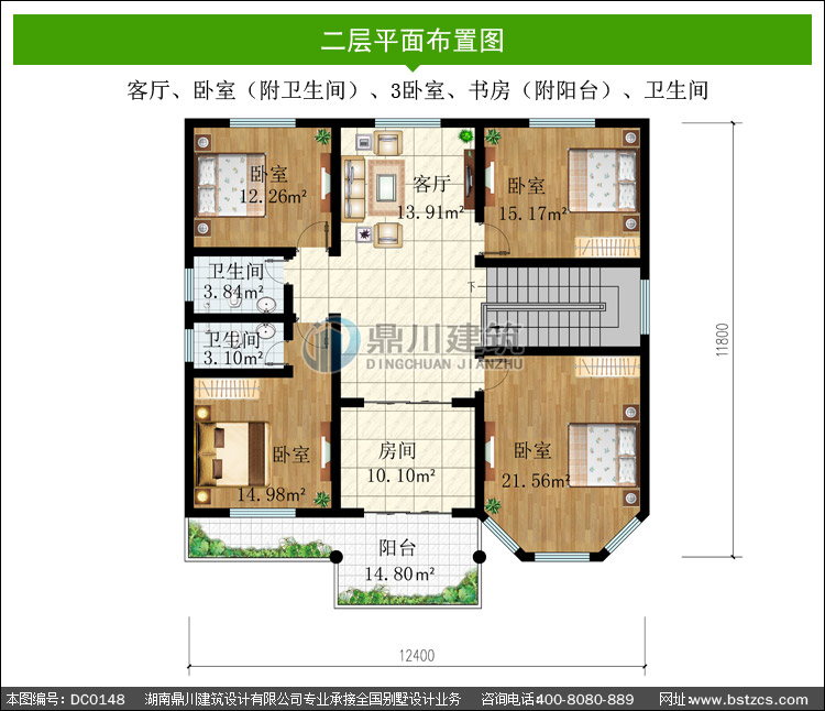 二 層: 客廳、臥室(附衛生間)、3臥室、書房(附陽臺)、衛生間