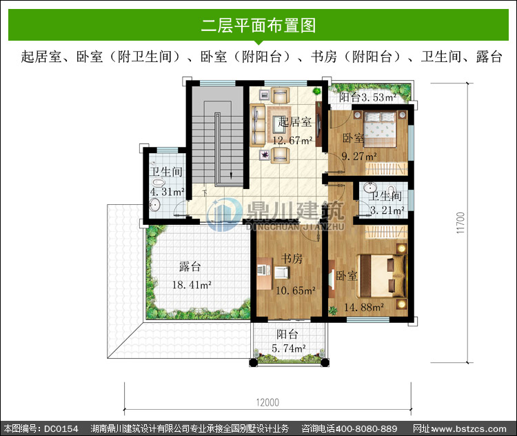 | 二 層: | 起居室、臥室(附衛生間)、臥室(附陽臺)、書房(附陽臺)、衛生間、露臺 | |||